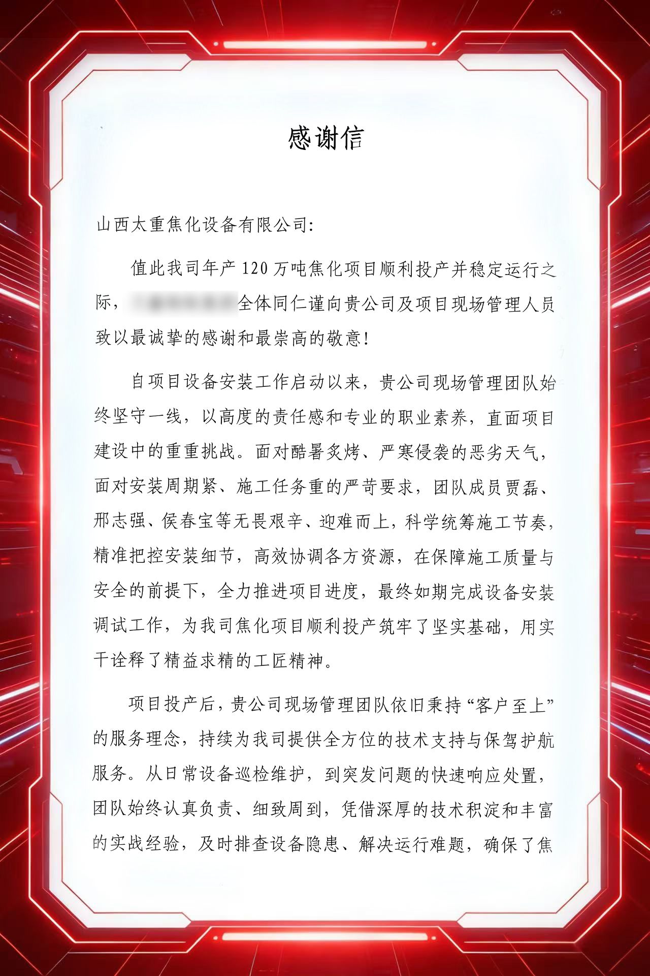 “过硬专业能力、顽强拼搏的工作作风和贴心细致的服务态度,让我们深受感动。”近日,某大型钢铁集团在发给太重的感谢信中,用这样一段话,对太重焦化公司现场管理团队在年产120万吨焦化项目建设中的责任担当给予高度评价。