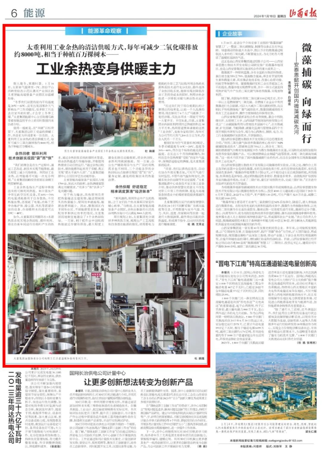 今日,山西日报《能源革命观察》专栏,对太重集团聚焦国家“双碳”目标,通过技术创新变废为宝,将工业余热变身供暖主力进行了重点报道。一直以来,太重集团持续践行“绿水青山就是金山银山”理念,着力构建绿色环保长效工作机制,加快推动公司绿色低碳转型发展,为实现国家战略贡献太重力量、展现国企担当。