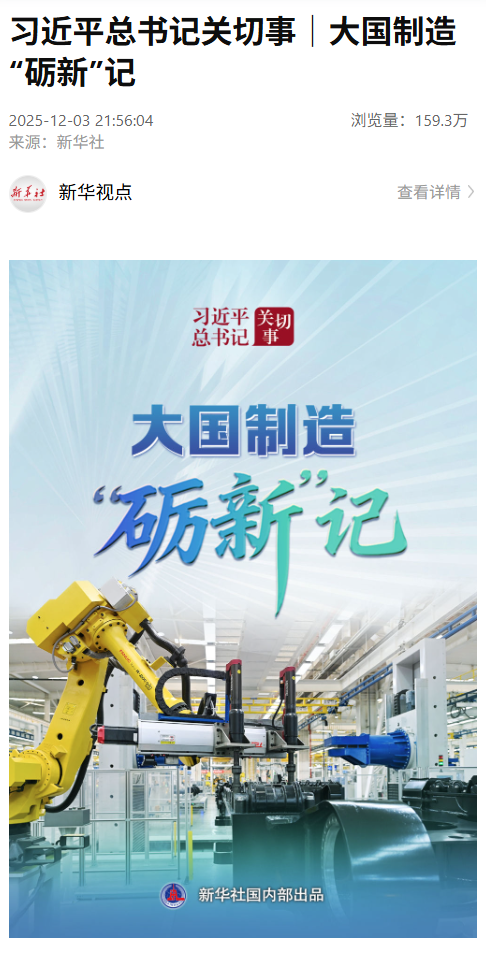制造业是立国之本、强国之基。近日,新华社客户端《习近平总书记关切事》专栏以《大国制造“砺新”记》为题,深度聚焦太重高端装备制造,获得广泛关注,浏览量近160万。12月4日,该报道在《新华每日电讯》头版头条刊发。